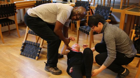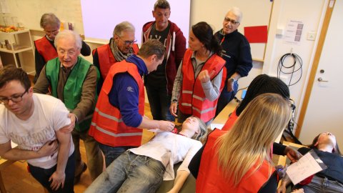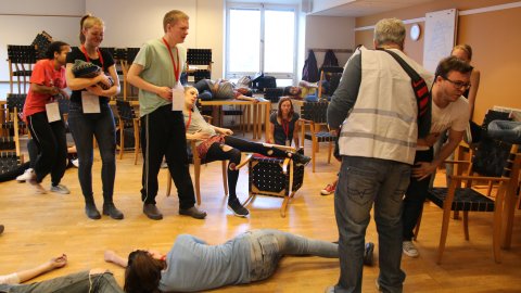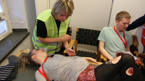 The victims are not real patients; they are 20 students from Karolinska University Hospital who have been briefed on their injuries and how to behave convincingly. All students wear make-up to fake injuries and a card around the neck presenting their vital signs. The triage team has to decide who is going to make it and who needs help first. Accordingly, they put cards of green, yellow or red around the patients’ wrists. Red indicates the most urgently needed surgery, yellow indicates required surgery that can wait, and green indicates only minor wounds. Dead and dying patients are assigned a black card.