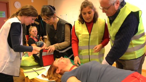 The training lasts 60 minutes. Sonia Peyrassol then gathers the field workers and the student victims. Victims discuss their injuries and their health condition in greater depth and talk about how they were treated. One student was playing a 17-year old boy with an unidentified object in his abdomen. He was put in the green category because he could walk. But when he arrived at the hospital green zone, they discovered the mistake and upgraded him to red.