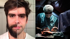 Till vänster: Gabriel startade egen insamling där han lovade raka av sig skägget om vännerna lyckas samla in mer än 10 000 kr till Läkare Utan Gränser. Till höger: uppblåsbar operationssal inuti vårt provisoriska sjukhus i Idlib, Syrien. Photo: Vänster: Gabriel Bergin Höger: Robin Meldrum/MSF