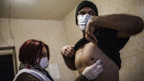 En patient med tuberkulos undersöks i Läkare Utan Gränsers projekt i Donetsk, Ukraina. Foto: Manu Brabo