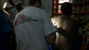 Sjukhuset i Bria, Centralafrikanska republiken. Läkaren Victor Fayette ser till en patient med kulhål i ryggen. Foto: Colin Delfosse