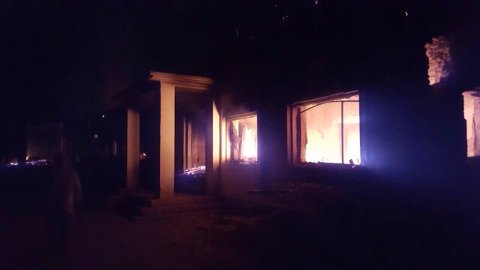 Vårt sjukhus i Kunduz i lågor efter bombningarna i lördags natt. Foto: Läkare Utan Gränser