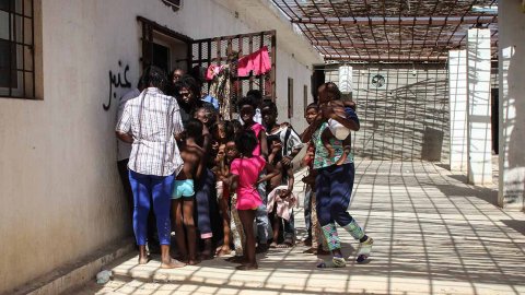 Kvinnor och barn i ett förvar i Khoms i Libyen. Foto: Sara Creta/Läkare Utan Gränser